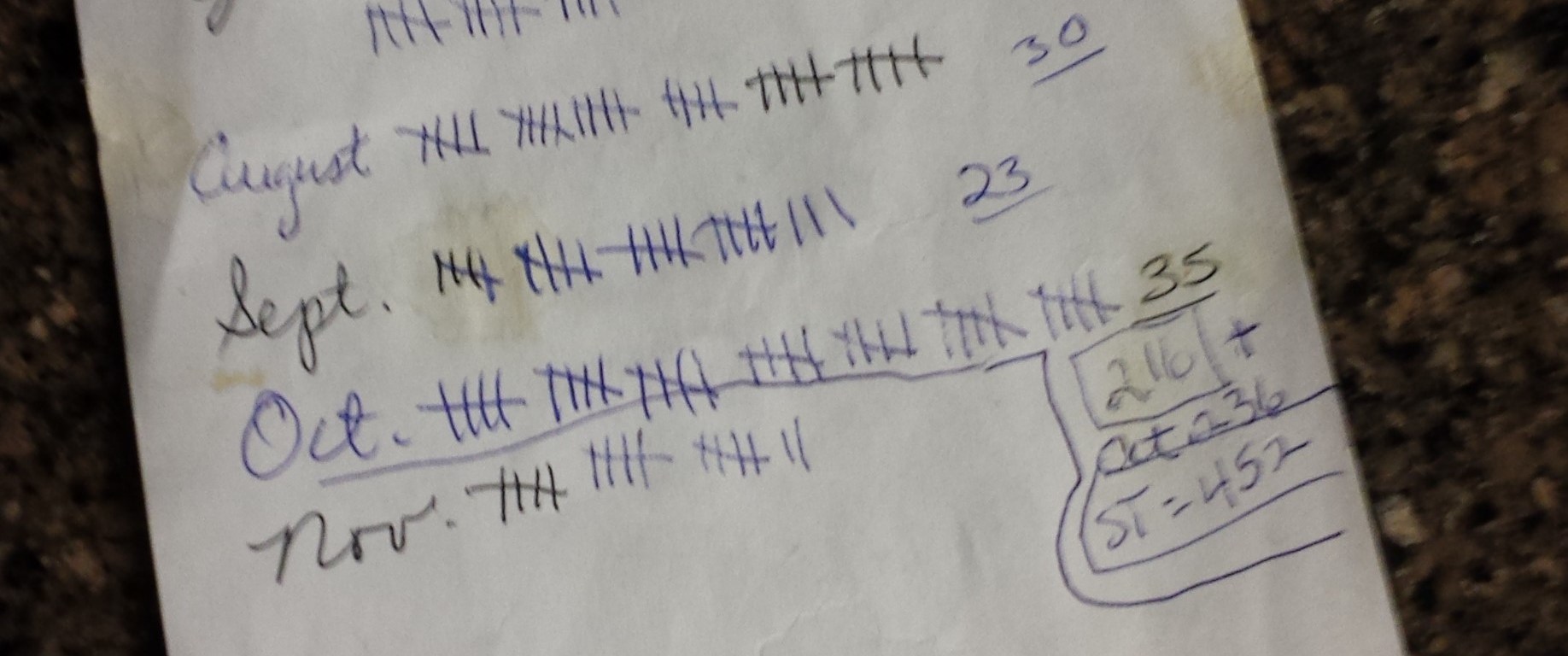 No reason to keep a tally then, if McDougall et al are to be believed. But I kept making the hash marks after every workout just in case. Gradually I realized that the tally had nothing to do with shoes. It is a record of accomplishment. It makes me feel great to see how many miles I have run (jogged). I am feeding my own ego, which feels akin to the earning of God’s favor when I think about it. The impulse will not die.