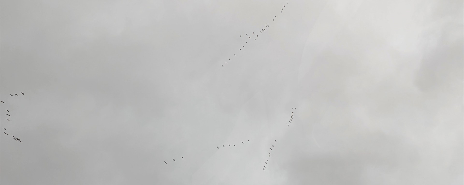 Winter Day in Nebraska I glance out, see the geese stitch the sky over Interstate 80 their ragged, urgent arrows aiming somewhere east southeast no big deal but they keep coming prophecies sliding like hieroglyphs against a cave wall of grey clouds as “I Got the Boy” blares on the pickup radio reflecting on the passage of time without resentment: “She got the future, I got the past” and once they’re behind us a few miles later a herd of Angus cattle trot in unison kicking up dust. Ten miles before the exit to Denver my husband notices how the wind tugging at us all day has died down. A cemetery appears on cue yonder on the side of a hill. I can barely detect the granite stones in the endless brown grass. It’s the conifers that catch the eye. I could count them they’re so clear and earnest marching in place ever greening.