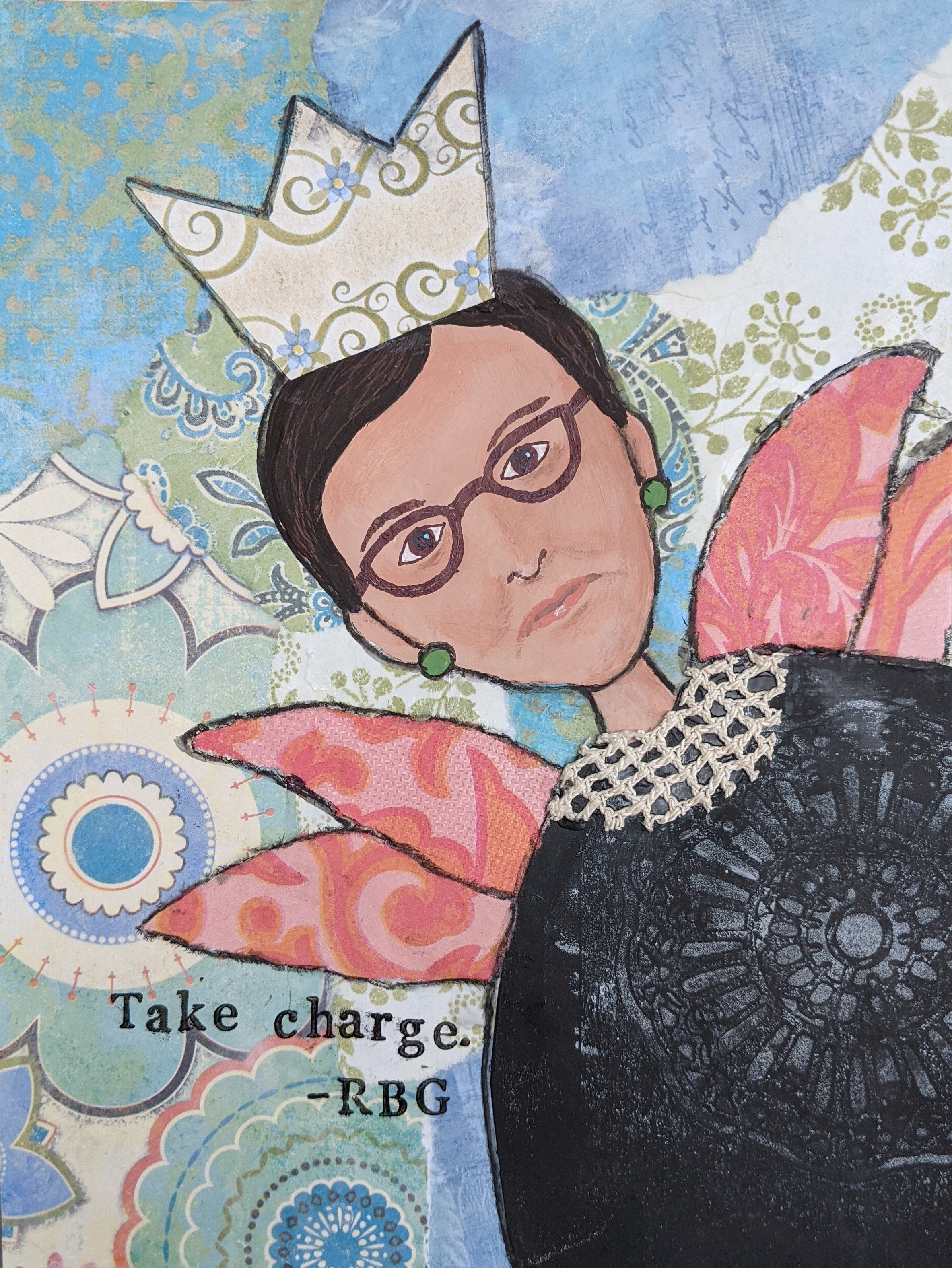 I am still finding my style. Gradually I have realized that I like to use words, repeating patterns, collage elements and faces in my work. I am slowly learning how to draw faces so I can use them in abstract pieces. I am pretty sure I don’t want to do representational art, because I gravitate toward at least some abstract elements that other artists employ.