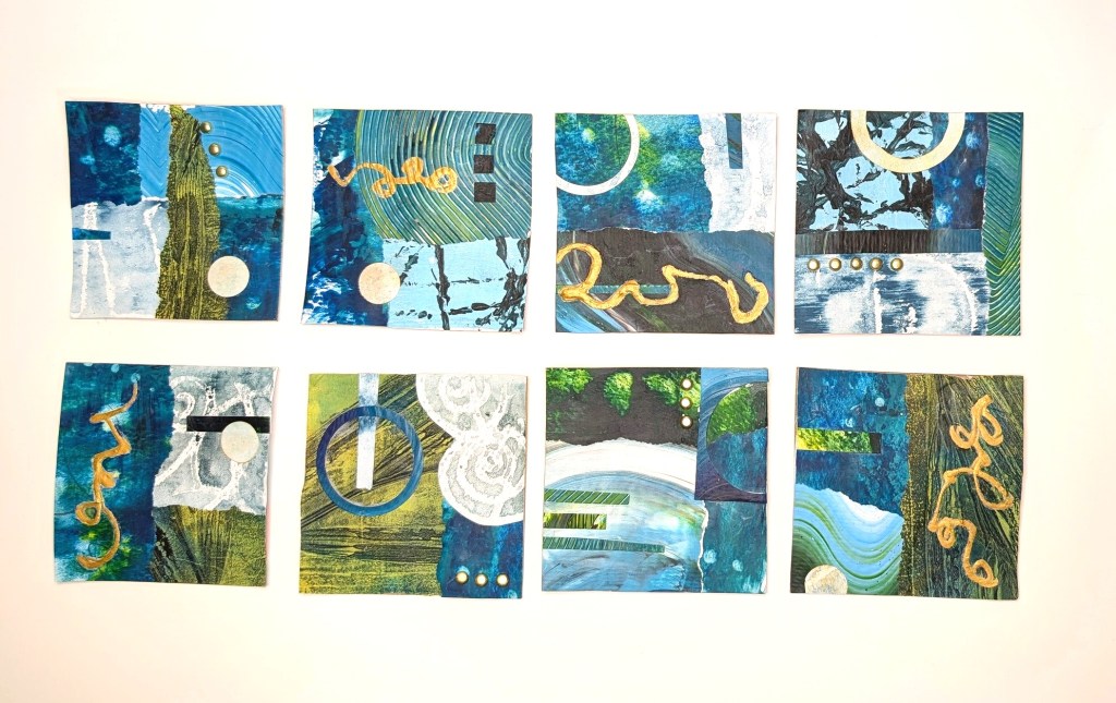 I spend hours in my art room these days, painting and tearing paper, gluing it onto card stock, chipboard or watercolor paper. I page through magazines to find interesting images or words to add to my creations. I notice the colors and shapes in everyday life, whether in nature or on a package I get in the mail.