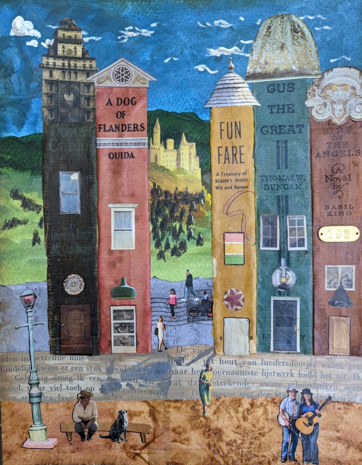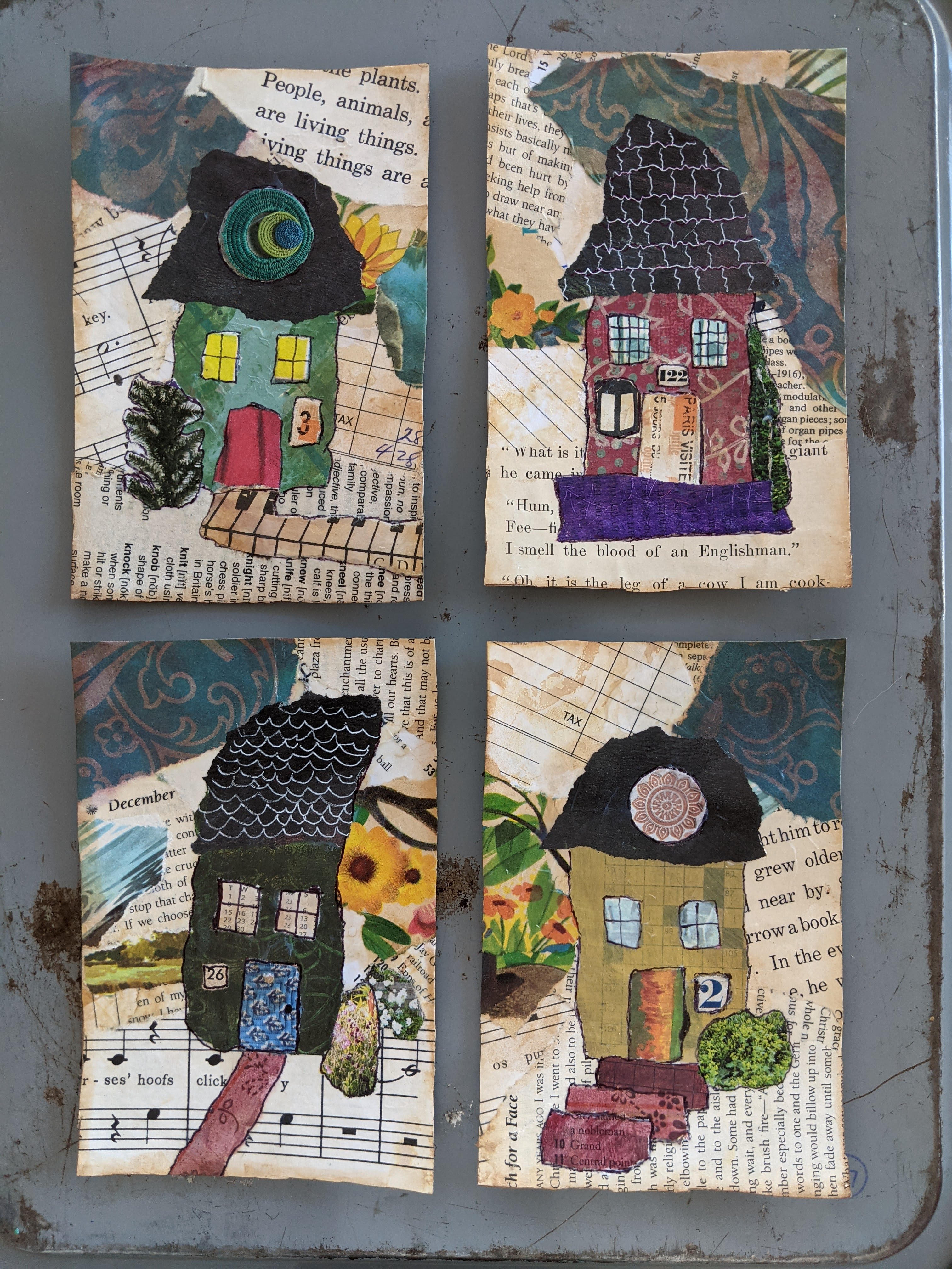 It all began with a “Tiny Tattered Houses” class offered by Jennifer Chamberlin online. I figured the $15 fee wasn’t too much to ask for an experiment in art. I was surprised how much I enjoyed painting paper just to tear it up and fashion a crooked little house in a 4”x6” format. I made three more to complete the set.