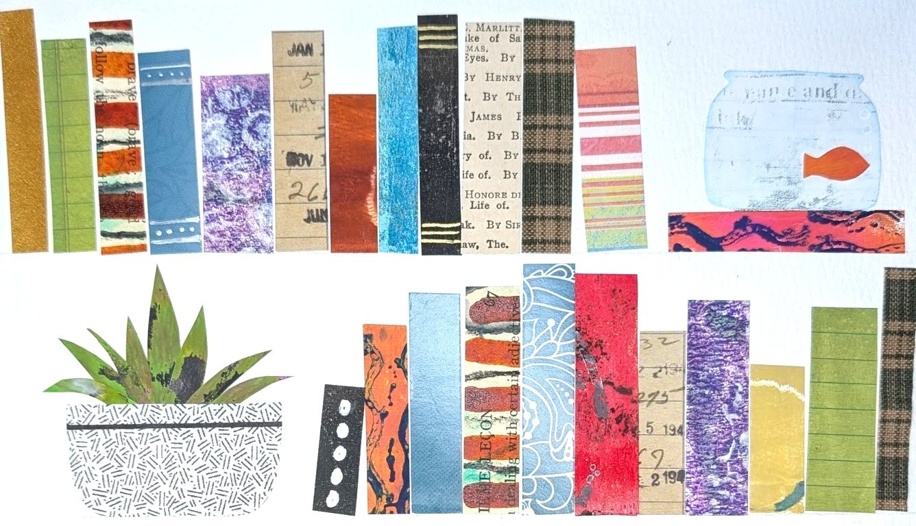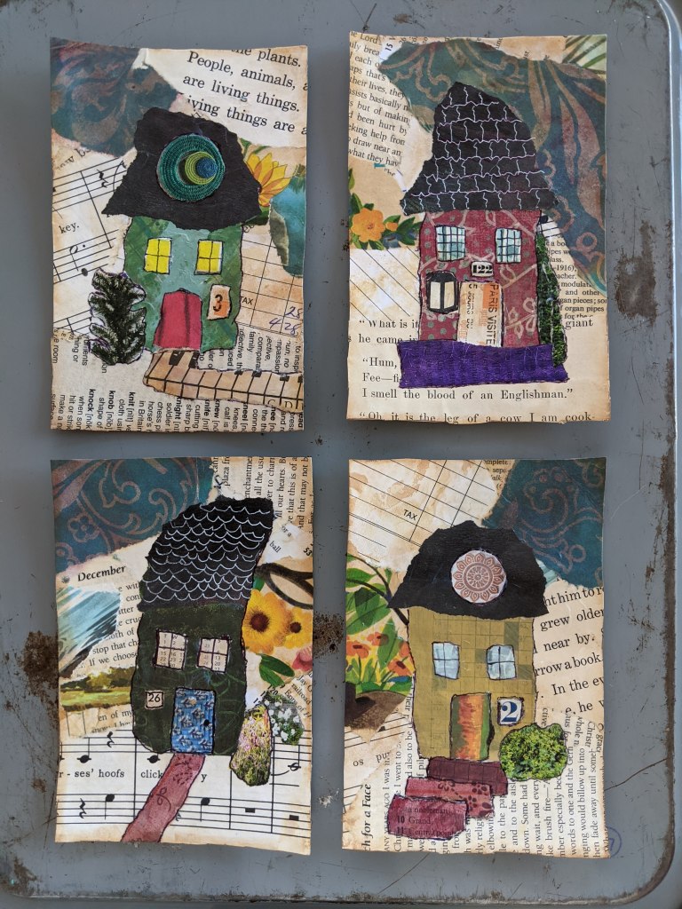 I paid for a yearly subscription to Jennifer Chamberlin’s The Maker Beehive hosted by the first teacher whose “Tiny Tattered Houses” project I relished, renewing the following year. Ready to move beyond folk style collage, I joined Louise Fletcher’s Art Tribe to expand my understanding of different media and styles. Both sources have wonderful Facebook groups whose members encourage exploration and share the joy of making things. It’s been rewarding to post what I make and receive comments. On a given evening you might find me watching one of the many classes about abstract art, drawing faces, etc. provided through the subscription.